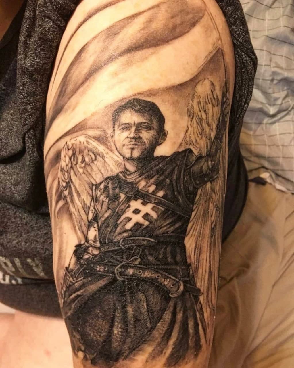 — Набіла, таму што майго сябра Вітольда Ашурка забілі ў турме. Я пабачыла малюнак, гэта быў Вітольд як беларускі гладыятар, мне ён спадабаўся. І вобраз апаведны, і Вітольд падобны. У нейкі момант падумалася, што можна яе набіць на плячы. Трохі параілася і перайшла да этапа выканання. Прайшло, пэўна, з паўгадзіны, як я ўжо знайшла аўтара малюнка і дамаўлялася на дзень, калі прыеду рабіць. Тыя, хто ведаюць Вітольда, пра татуіроўку ведаюць. Просяць паказаць, калі яшчэ не бачылі. Розныя бываюць эмоцыі, але, падаецца, збольшага яны натхняльныя. Для астатніх гэта, напэўна, проста прыгожая татуіроўка, бо яна сама па сабе даволі складаная і дэталізаваная. Акрамя самога Вітольда, ёсць элемент арнаменту і бел-чырвона-белы сцяг не ў колеры. Калі прышчэпку рабіла, доктар сказаў: «Які ў вас ладны гладыятар». Гэтая татуіроўка — гэта свядомы, можна нават сказаць ідэалагічны выбар, так што, безумоўна, рэфлексія. Па-першае, гэта памяць пра Вітольда і адказнасць за тое, каб ягоная гісторыя не была забытая. Па-другое, я часам пра яе думаю, як пра анёла-абаронцу, які ў мяне на левым плячы. Такой татуіроўкі пакуль больш ні ў каго няма. Але калі з’явіцца, то гэта будзе правільна, бо Вітольд — герой Беларусі, а на ёй ён менавіта такі і ёсць.