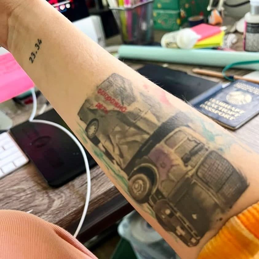 — «23.34» — должно было быть маленьким и неброским, просто как напоминание себе из концепции «все шрамы — это твоя история» (Наталья отбывала по этой статье сутки — MOST). Черновой эскиз автозака придумывала сама, чистовой вариант уже дорабатывал тату-мастер. Автозак — это про задержания несовершеннолетних. Потому что дети не должны бороться за свободу, она должна быть у них при рождении. «23.34» стало просто точкой в моем прощании с родиной. Ее я делала уже за пределами страны, в которую, к сожалению, вернуться не могу. Типа заскучаю по родственникам-друзьям, посмотрю на нее, вспомню что «товарищ майор» меня все еще ждет — и отпускает. Я нахожусь сейчас в США, так что про татуировки меня не спрашивают. Здесь для людей это просто красивый рисунок и скорее напоминает трак, чем автозак. Но если вопросы задают, рассказываю без эмоций и сухие факты. Потому что уже слегка подустала от жалости и обеспокоенности людей, обычно когда все слышат, как я спокойно рассказываю про протесты и СИЗО, думают, что мне нужна помощь или что у меня посттравматический синдром. Для меня татуировки — это как шрамы, которые я храню, чтобы не забыть что-то важное из жизни.