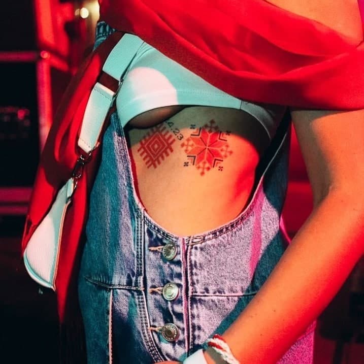 — Когда меня задержали в 2020 году, мои татуировки фотографировали, — рассказывает MOST Евгения. — Я тогда ещё очень удивилась, зачем им это вот все. Люди делают татуировки по разным причинам: кто-то украшает своё тело, кто-то оставляет на теле символ значимого для себя события, кто-то рефлексирует. После событий августа 2020 года и до сих пор я вижу в соцсетях и в жизни знакомых, которые набивают что-то связанное с этим: арест, эмиграция, потеря дома, потеря любимого человека. Это стало некой рефлексией, тело стало инструментом несогласия. А потом появилась новость про Пашу Белоуса (основатель магазина Symbal.bу — MOST), которому вменили административку за «пикет» татуировкой, на которой был бчб-флажок и имя его сына.