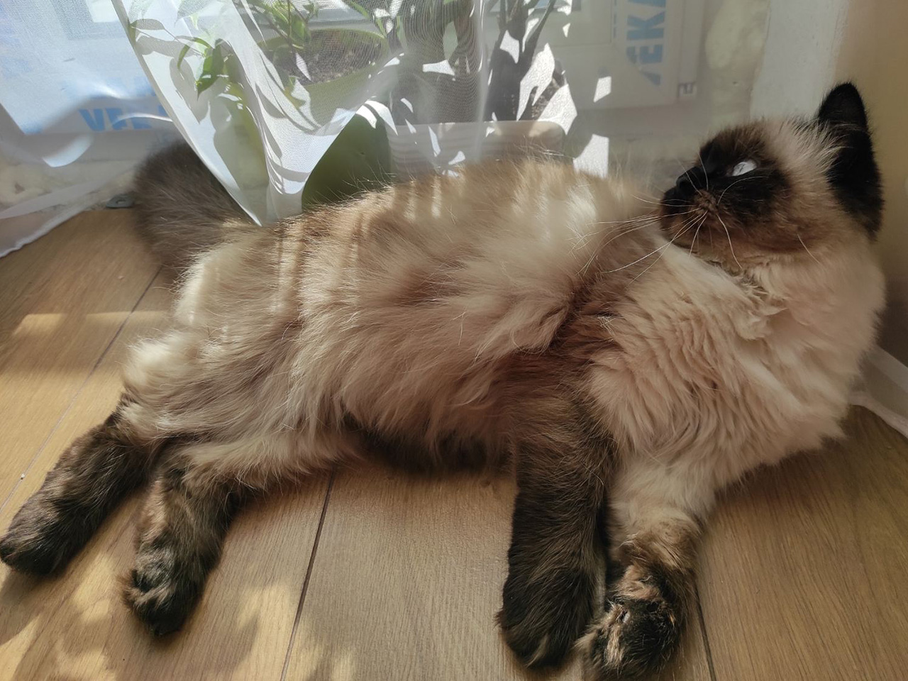 Карамельке около года. Она похожа на кошку сиамской породы, но с шикарной длинной шерстью. Раньше она жила в Киеве вместе с пожилым хозяином.