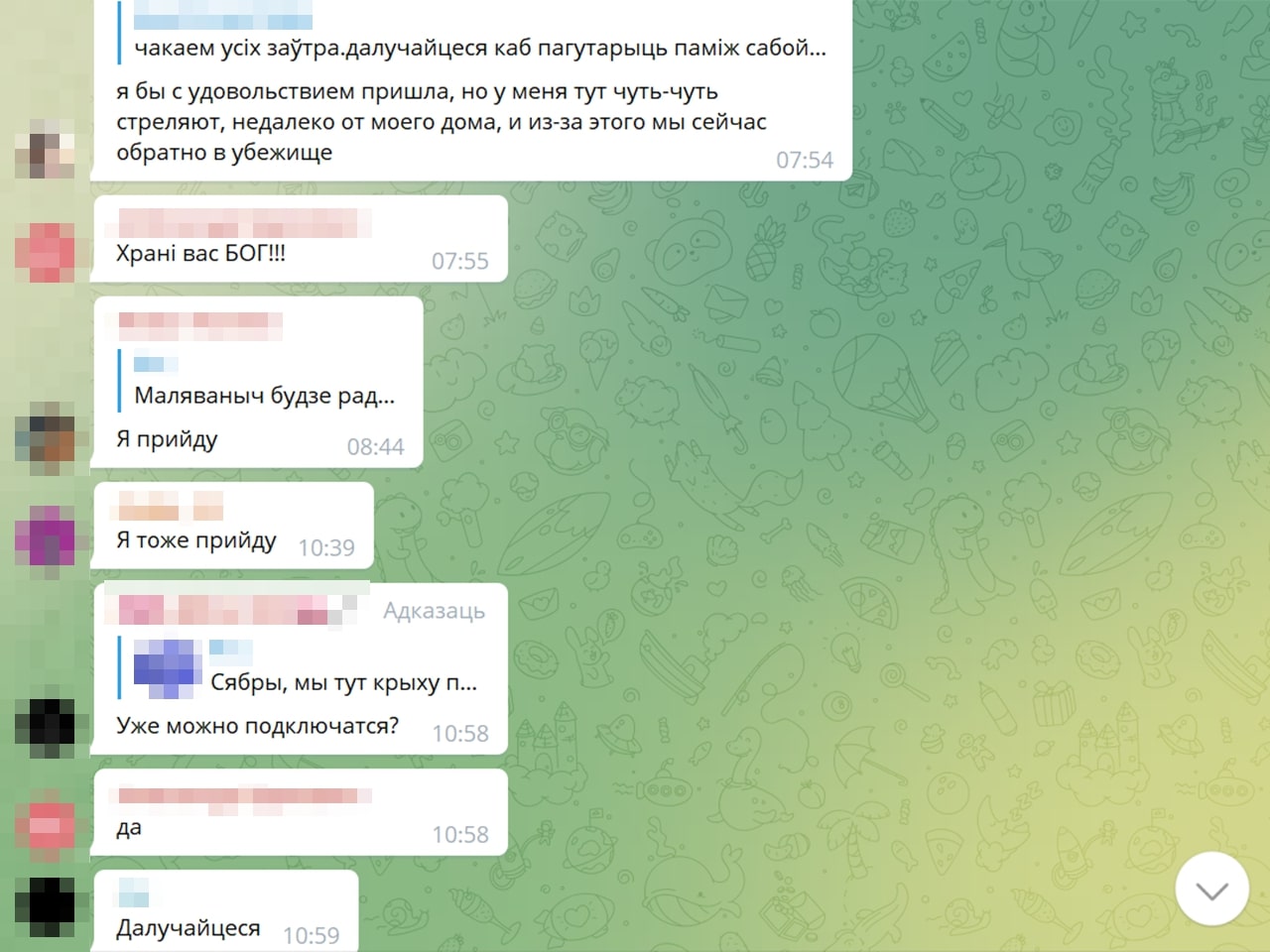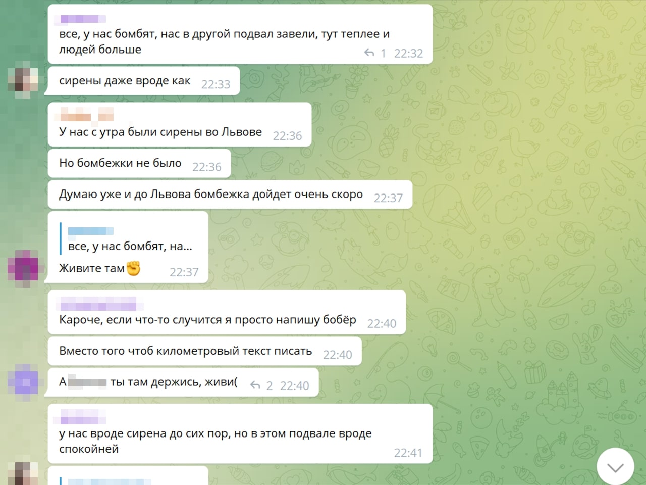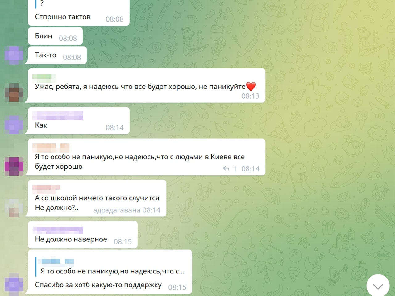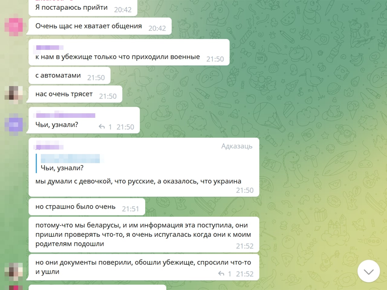 — Калі чытаю дзіцячы чат — ну гэта сапраўдныя хронікі вайны. Там відаць, як гэта ўсё ўспрымаюць дзеці. Напрыклад: «у нас выбіла вокны, тата сказаў, што я буду спаць у куртцы ў калідоры, але я не расстройваюся, пайду з’ем булачку». Пра тое, што не могуць выехаць, што мама ўвесь час плача. Нехта едзе з Украіны, іншыя пішуць: «ну як вы, дзе?», ведаючы, што расстрэльваюць гуманітарныя калідоры. Расказваю, і мурашы па скуры.