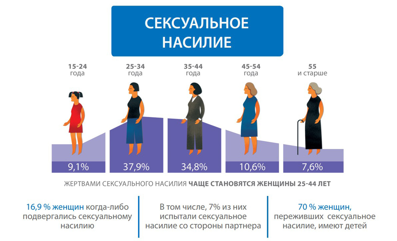 Во время формализованного интервью 16,9% женщин рассказали о пережитом сексуальном насилии. Жертвами сексуального насилия чаще становятся женщины в возрасте 25-44 лет.