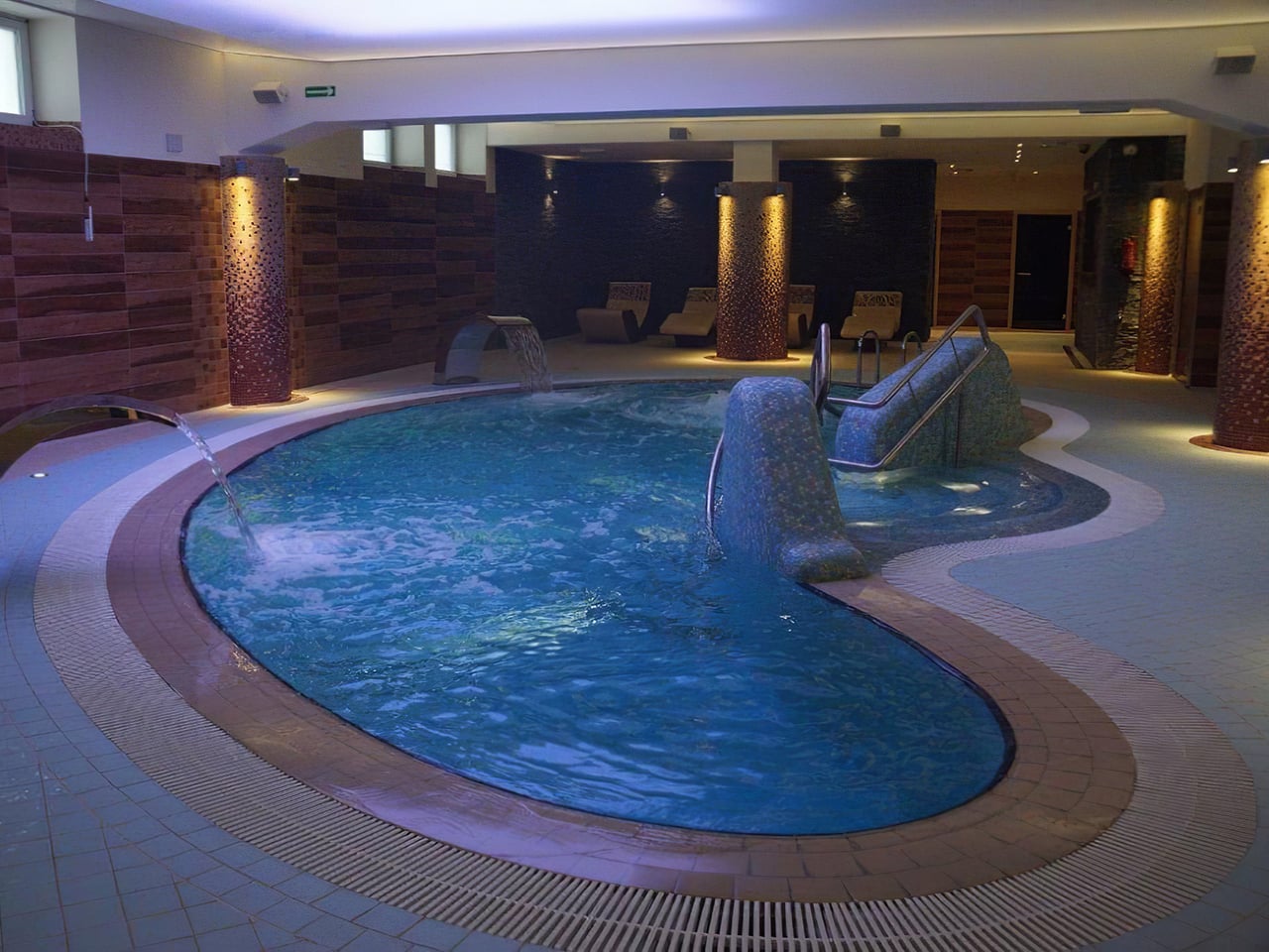 У цэнтры памяшкання рэкрэацыйны басейн — глыбінёй паўтара метра з гейзерам і двума воднымі масажнымі каскадамі. З аднаго боку — джакузі і два бродзікі для дзяцей (адзін заяўлены як з водным парасонам, але пры мне гэтак не працаваў). А з іншага — сауны, гарачыя лежакі і снежная пячора. Сауны чатырох відаў — сухая, паўсухая, інфрачырвоная, паравая. Кожная па-свойму крутая, галоўнае не забываць здымаць тапкі на ўваходзе (пра гэта таксама вісяць напаміналкі). Ëсць душоўкі для кантраснага душа (таксама падпісаныя), якія ўвогуле ідэальныя, калі выйсці пад іх са снежнага гроту — тэмпература ў ім, дарэчы, мінус 15.