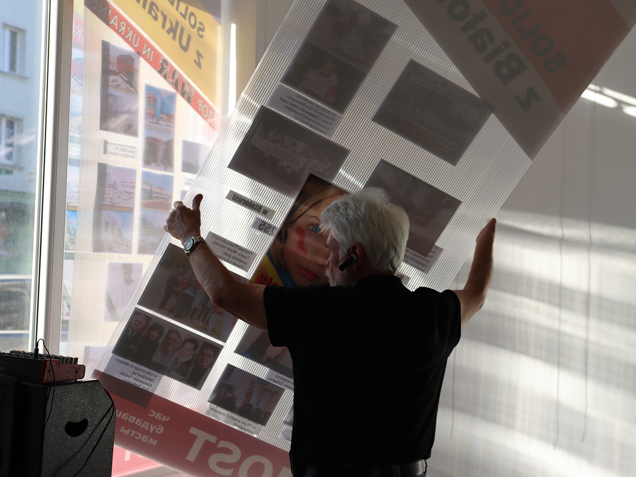 Ідучы пешкі па вуліцы Сянкевіча ў Беластоку, нельга не заўважыць партрэты ды фота ў вокнах будынка за нумарам 44. Так, гэта рэдакцыя MOST і каворкінг для беларускіх журналістаў MediaPort Belarus. Адно акно прысвечана Беларусі, іншае — Украіне. Фота абнаўляюцца штотыдзень. Мінакі спыняюцца, разглядаюць, абмяркоўваюць.