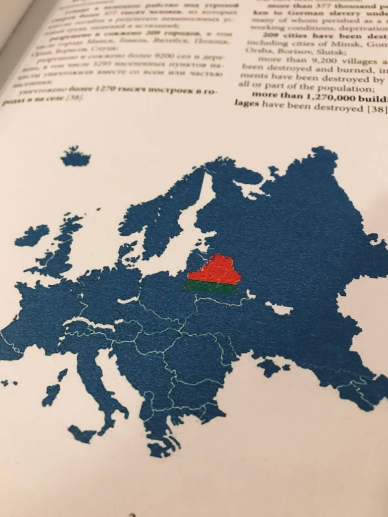 Кніга падпісана да друку 16 чэрвеня 2022 года. Альбомны фармат, цвёрдая вокладка, шмат ілюстрацый. Вёрстка са шматлікімі ўстаўкамі – як падручнік. На першых старонках бачым карту Еўропы, на якой адсутнічае мяжа паміж Расіяй і Украінай. Але гэта — толькі пачатак.