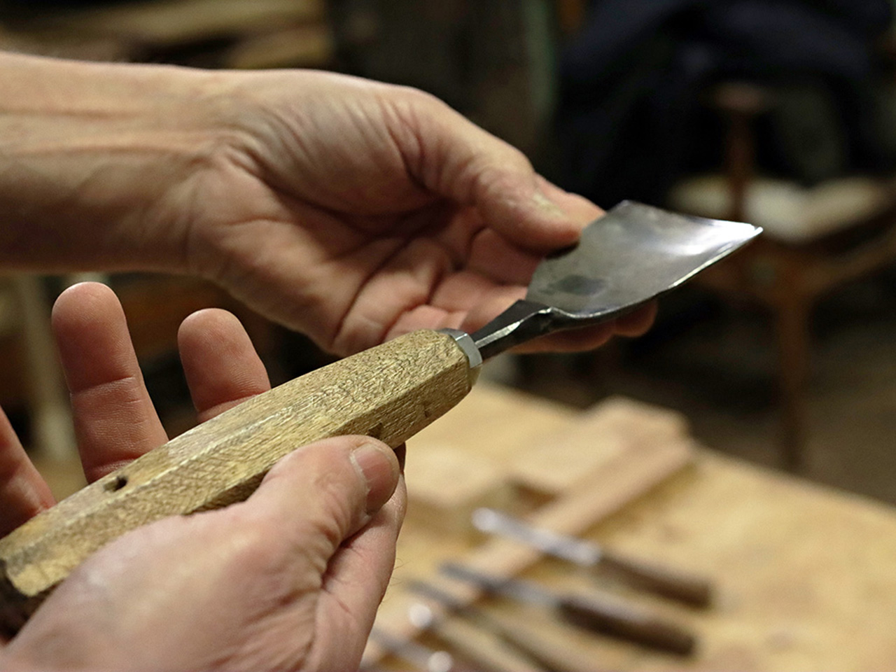 — Кожны год з’яўляюцца новыя стамескі, бо для новай працы можа спатрэбіцца новы інструмент. Маю кузню тут — калі чагосьці не хапае, то на месцы і вырабляю. Нешта я купіў, штосьці сам зрабіў, нейкімі інструментамі памяняўся. Напрыклад, — майстар паказвае інструмент з металічнай часткай незвычайнай формы, — вось на гэту памяняўся з літоўцам адным. А мой разец у яго. Разьбяры робяць так.