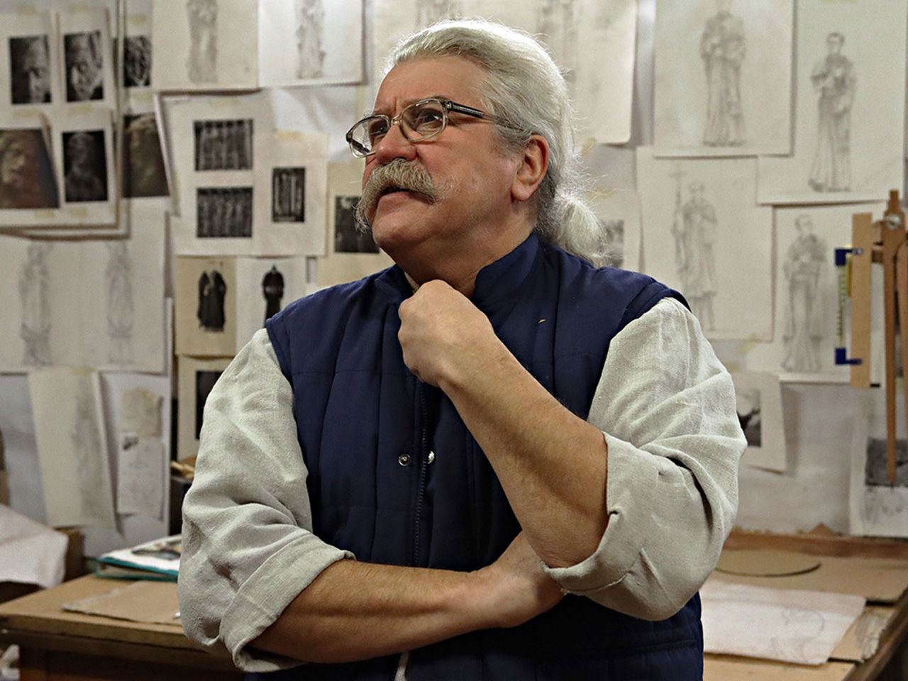 Тры вялікія фігуры, якія стаяць на паддонах пасярод майстэрні, амаль гатовыя. За зіму майстар даробіць іх чыставую абробку, і возьмецца за яшчэ дзве.