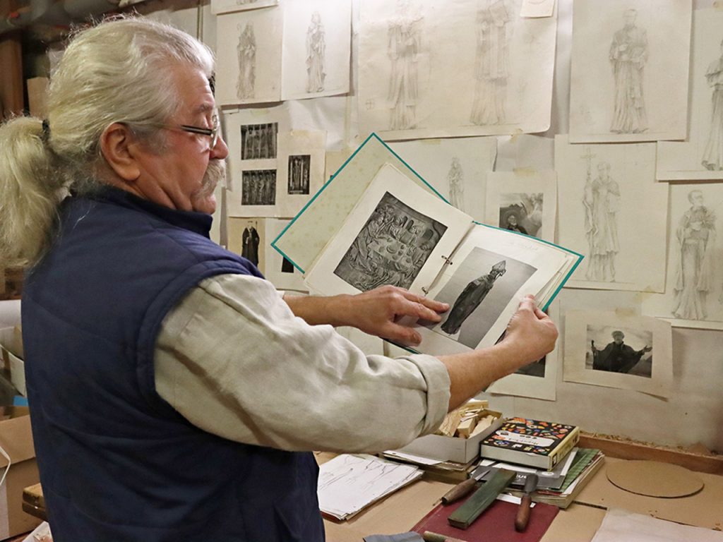 — Пасля таго, як мы абмеркавалі з праектантам, што патрабуецца, я раблю малюнкі і нясу іх да эксперта па ўбранню касцёла, які мае тэалагічныя і мастацкія веды. Потым я раблю мадэль з пластыліну і ўзгадняю яе з праектантам. Калі фігура малая, то магу зрабіць пробнік з дрэва, каб паспрабаваць новы матэрыял.