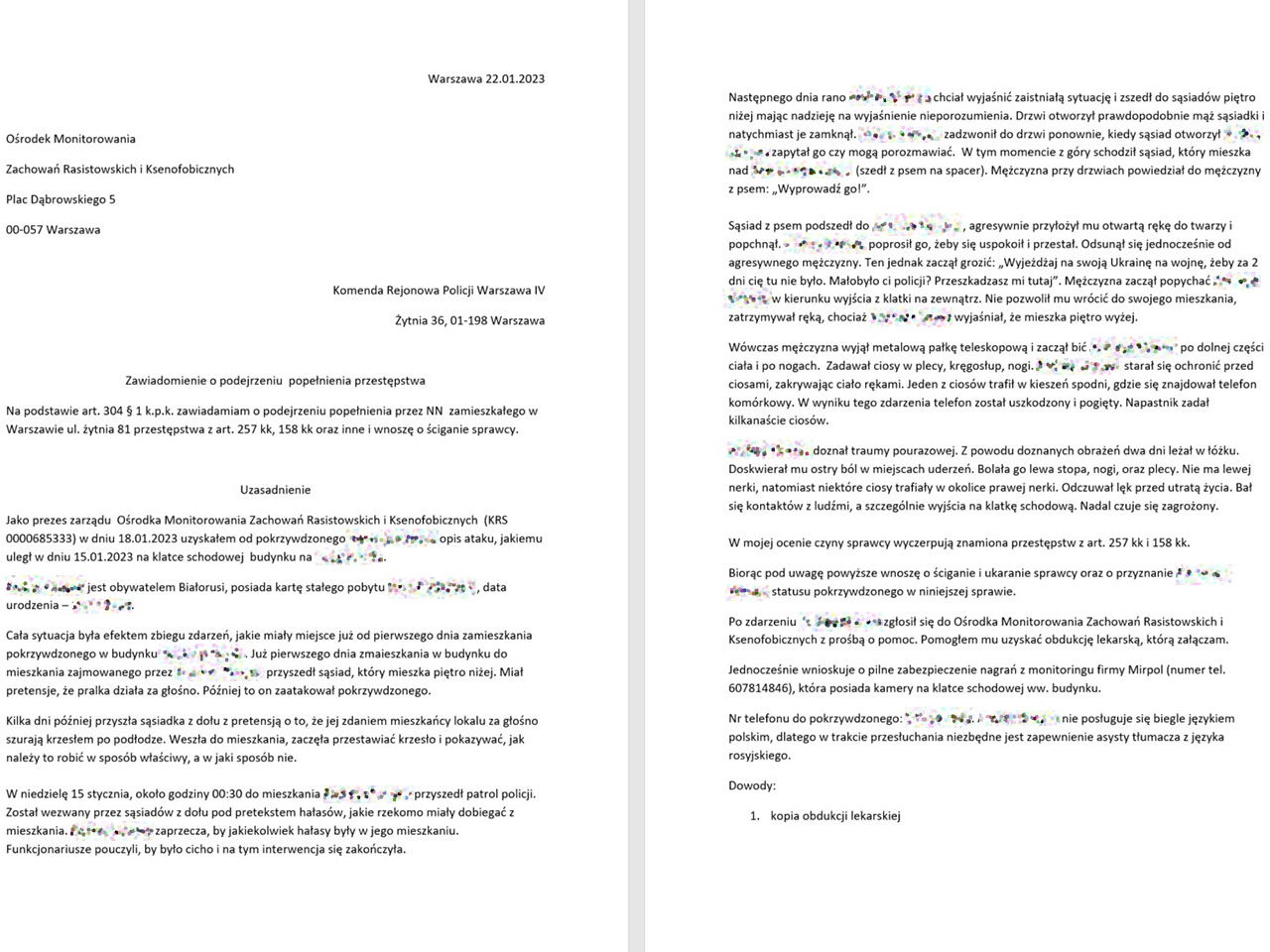 Для начала про избиение Александр рассказал арендодателю. Собственник квартиры сказал, что сосед, который его бил, это бывший полицейский. И не факт, что его накажут. Тогда свою историю парень опубликовал в одной из беларусских групп в Facebook и спросил у соотечественников, как ему поступить. Там Александру посоветовали организацию, которая отстаивает права иностранцев в Польше, работает по вопросам дискриминации по национальному признаку (Ośrodek Monitorowania Zachowań Rasistowskich i Ksenofobicznych).