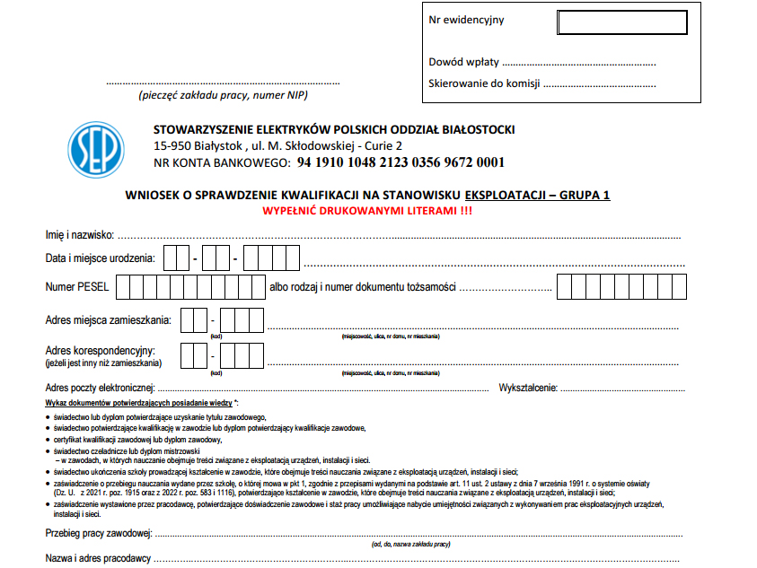 - На сайте слева найти вкладку «Szkolenia i egzaminy», скачать 2 документа: заявление (wniosek o sprawdzenie kwalifikacji), справку от работодателя (zaświadczenie od pracodawcy), заполнить их и взять с собой на экзамен.