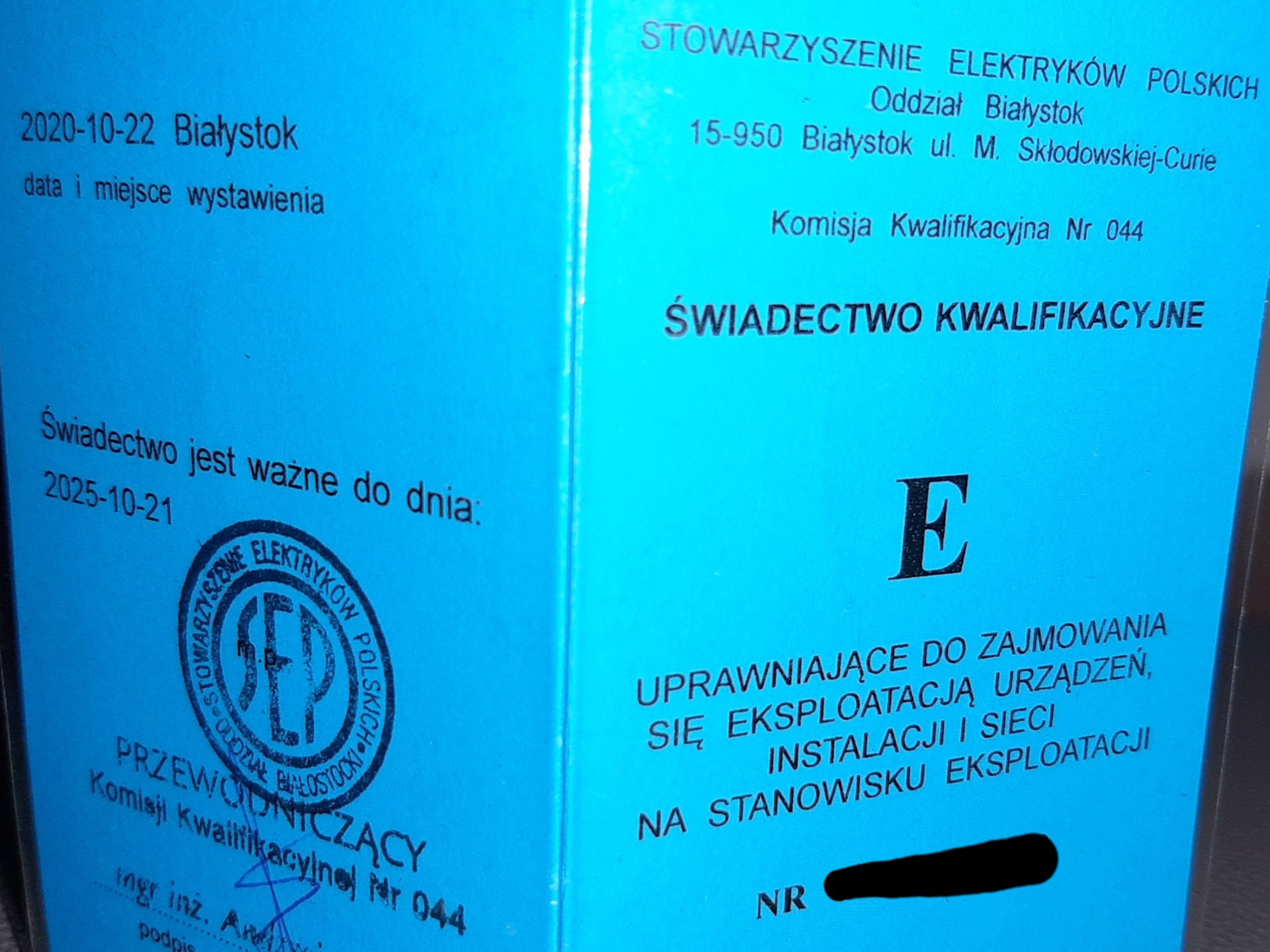 В конце 2020 года я устроилась инженером в польскую энергетическую компанию в Белостоке. Одним из обязательных условий работы было наличие свидетельства электрика (uprawnienia SEP) — сертификата, который даёт право работать с электричеством и всем, что с ним связано. В офисе шутили, что в Польше без этих «корочек» уборщица не имеет права даже пылесос включить, так как работа с электроприбором несёт потенциальную опасность. Для получения этого документа нужно сдавать экзамен. Это может сделать любой человек, достигший 18 лет и имеющий минимум базовое образование. Свидетельство признаётся во всех странах ЕС и выдаётся сроком на пять лет, по истечении которых необходимо снова подтверждать квалификацию.
