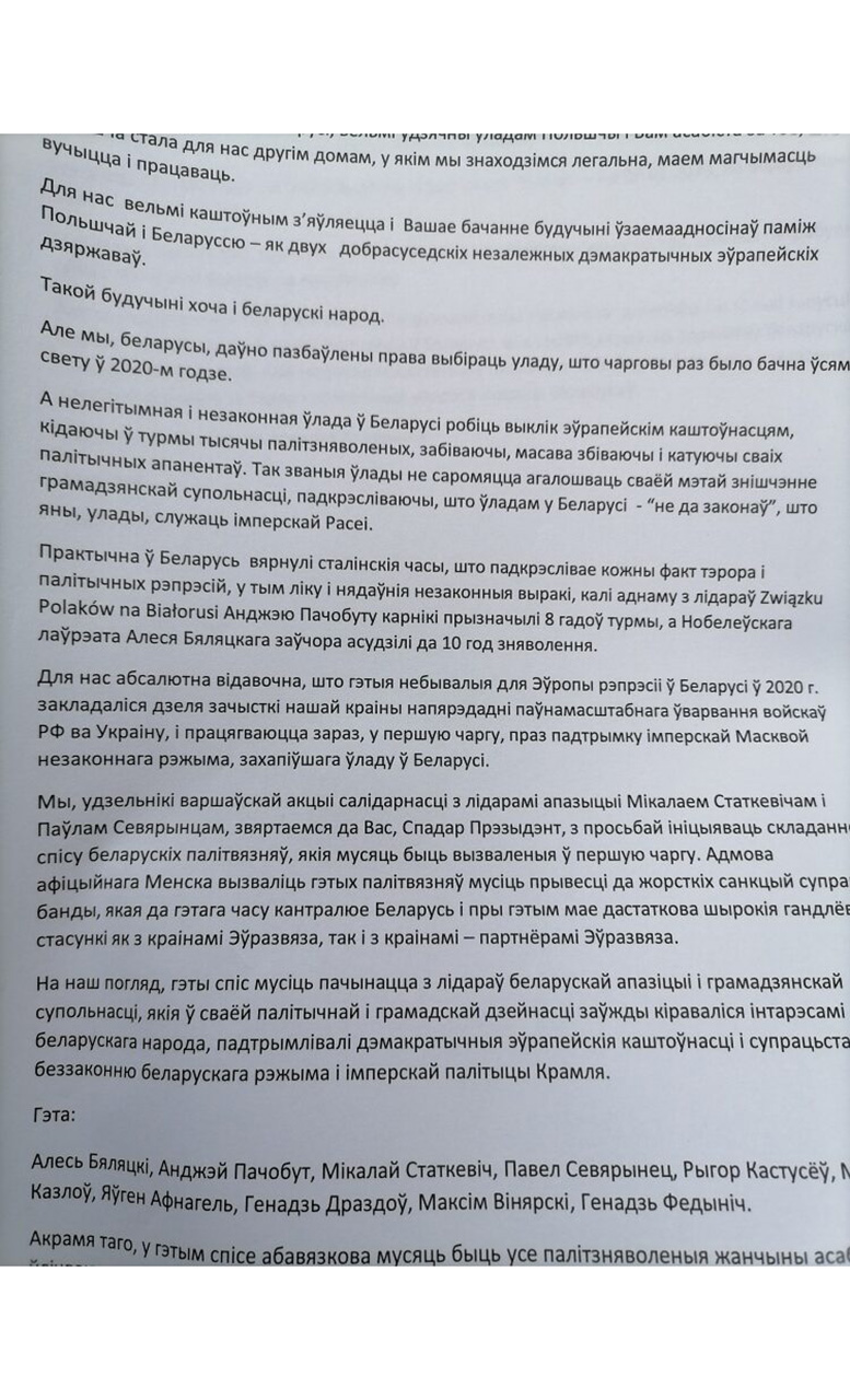 беларусы прынеслі ліст прэзідэнту Польшчы