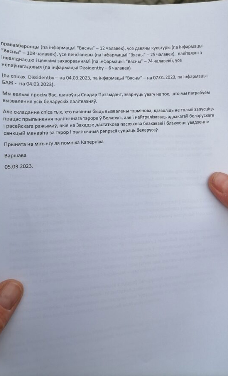 Зварот перадалі ў канцэлярыю Анджэя Дуды 15 сакавіка. Мэта звароту — пачаць вызваляць беларускіх палітвязняў спачатку па спісе. Аўтары мяркуюць, што гэты спіс «мусіць пачынацца з лідараў беларускай апазіцыі і грамадзянскай супольнасці», паведамляе «Позірк».