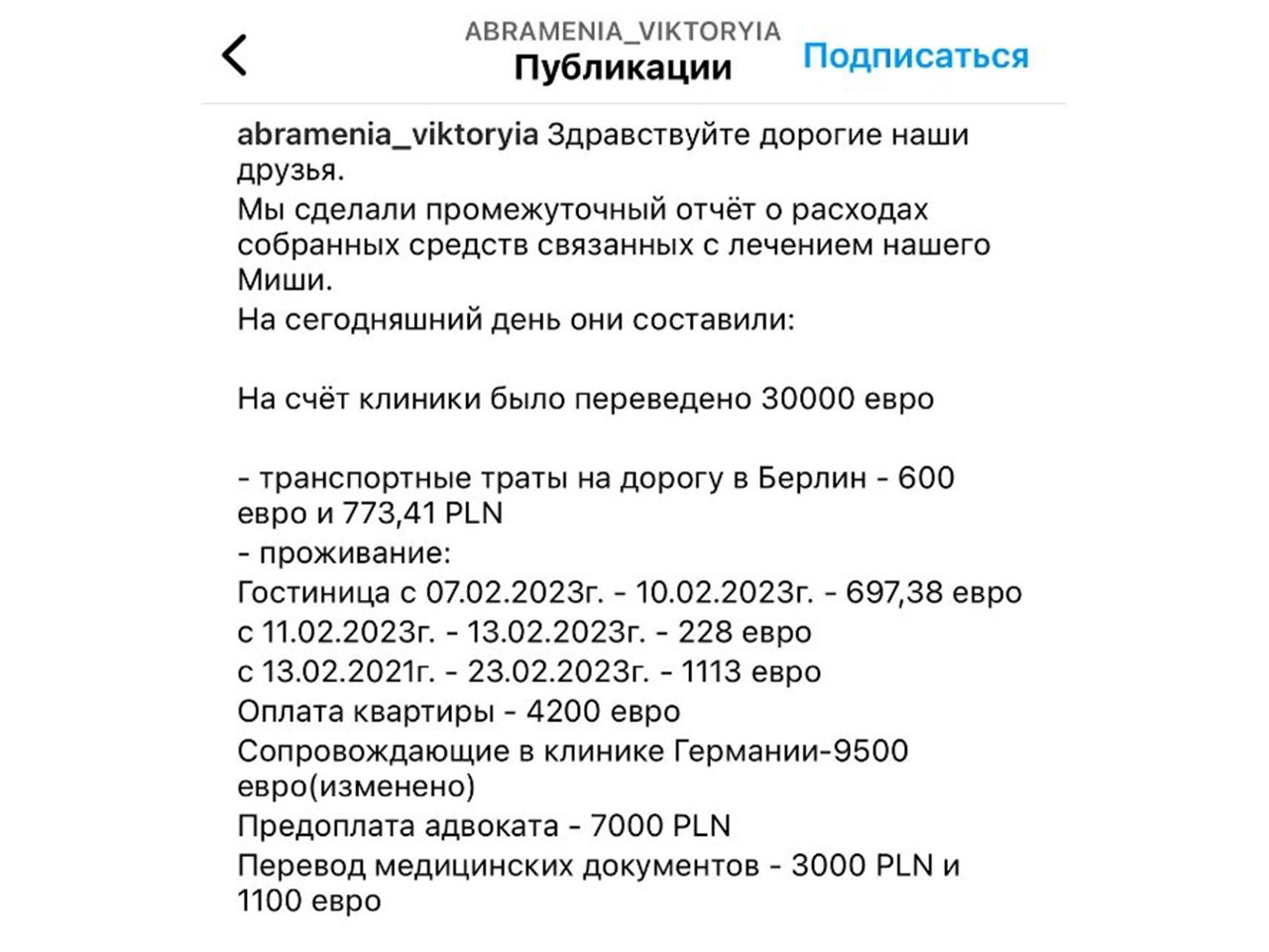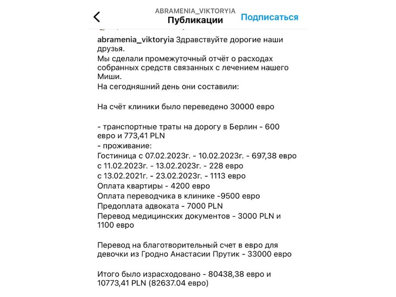 Такие комиссии, как нам пояснили в банке, взымаются в случае перевода денег на иностранные счета. Но куда, на что и в каком размере сделаны были эти переводы до сих пор не известно. А в это время вопросов у людей в соцсетях становится всё больше. Люди ждут отчёта и диагноза Миши. Первый отчёт Виктория публикует 5 февраля — 10000 евро для оплаты жилья в Берлине и на дорогу от Белостока до Берлина. Очень важное уточнение: бóльшую часть денег Виктория получила на свои обычные дебетовые карты в РП. В Беларуси были открыты несколько благотворительных счетов, с которых девушка быстро конвертирует пришедшие деньги в евро. В Польше благотворительный счет Виктория так и не открыла, а значит до сегодня имеет право распоряжаться пожертвованиями на свое усмотрение.
