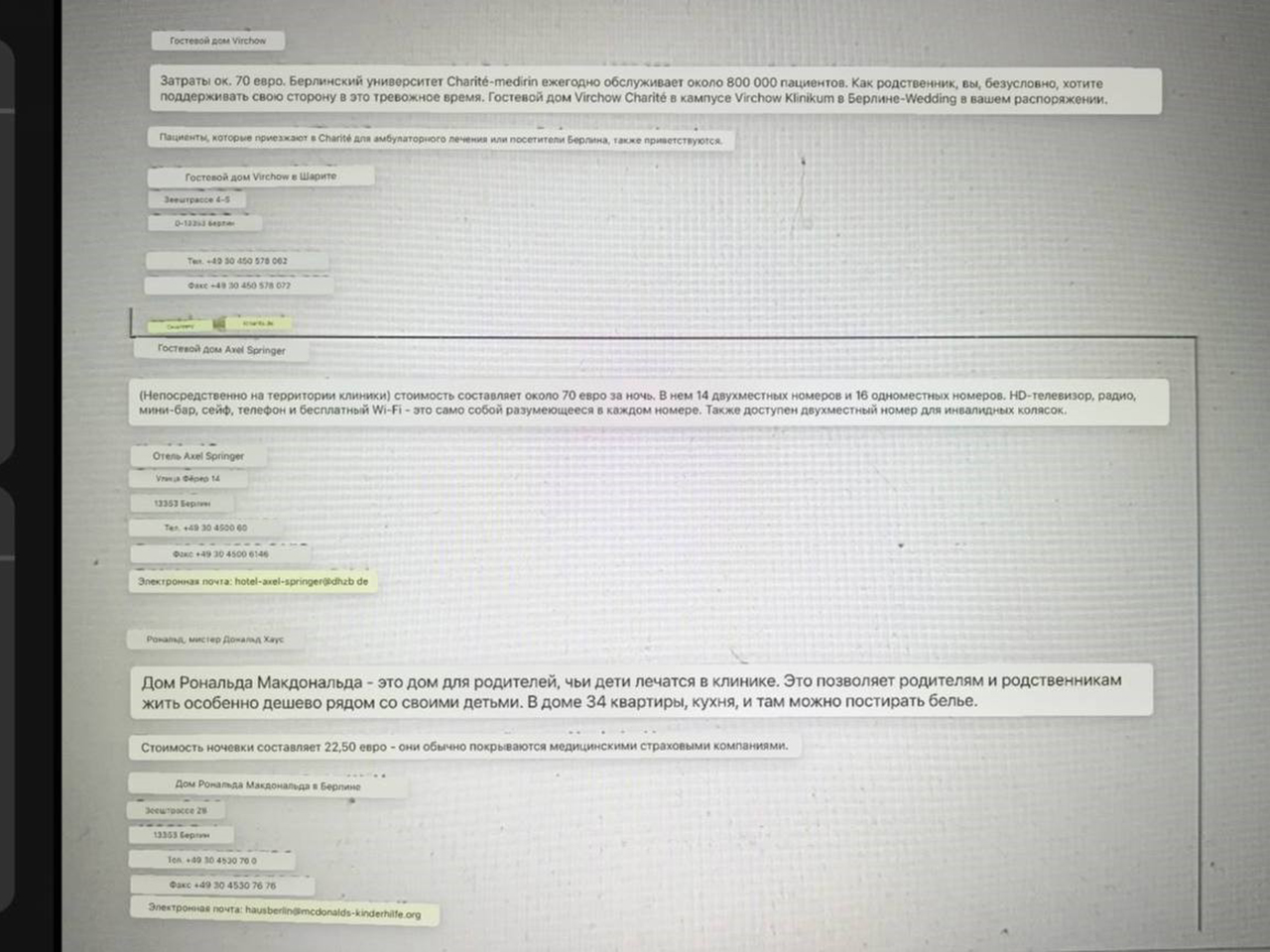 Обследования и дальнейшие манипуляции в Варшаве, девушке по-прежнему предоставляются БЕСПЛАТНО. Но не дожидаясь ответа из Варшавской клиники, она подает запрос в немецкую клинику Шарите. Клиника известная на постсоветском пространстве со времён Раисы Горбачевой, которая там лечилась от онкологии. Клиника частная и специализирующаяся на сложной онкологии.