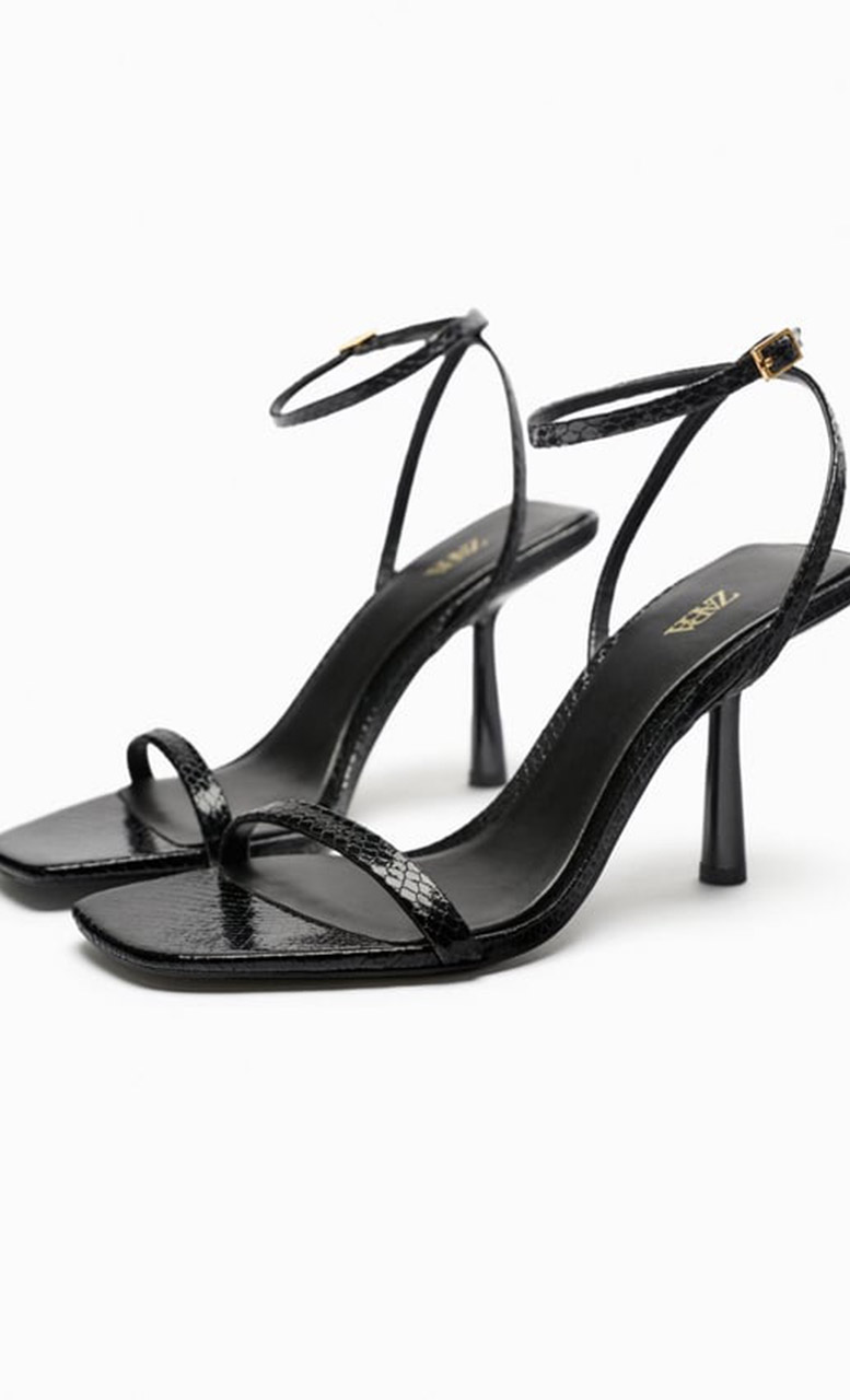 К платью можно взять стильные черные босоножки на высоком каблуке с квадратным носком и ремешком на щиколотке.
