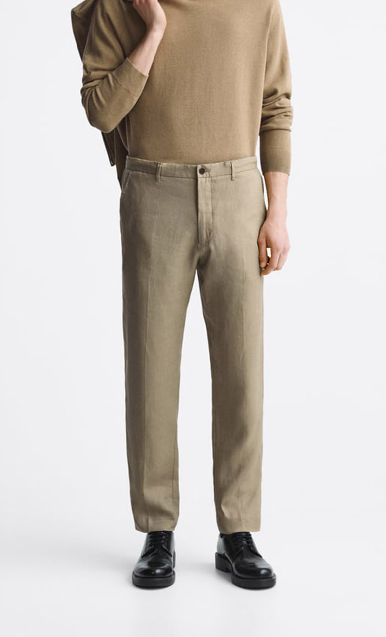 Мужские брюки из льняной ткани с эластичным поясом, представленные в ZARA в четырех цветах: чёрный, белый, коричневый, бежевый, обойдутся мужчинам в 169 BYN в Беларуси и в 179 PLN (118 BYN) в Польше.
