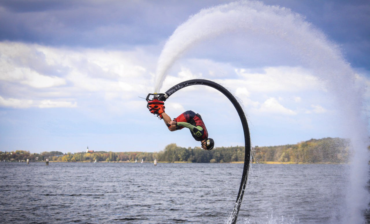 Flyboard — это специальная доска с турбиной, которая с большой силой выталкивает воду, благодаря чему человек может стоять и подниматься, иногда даже на 10 метров.