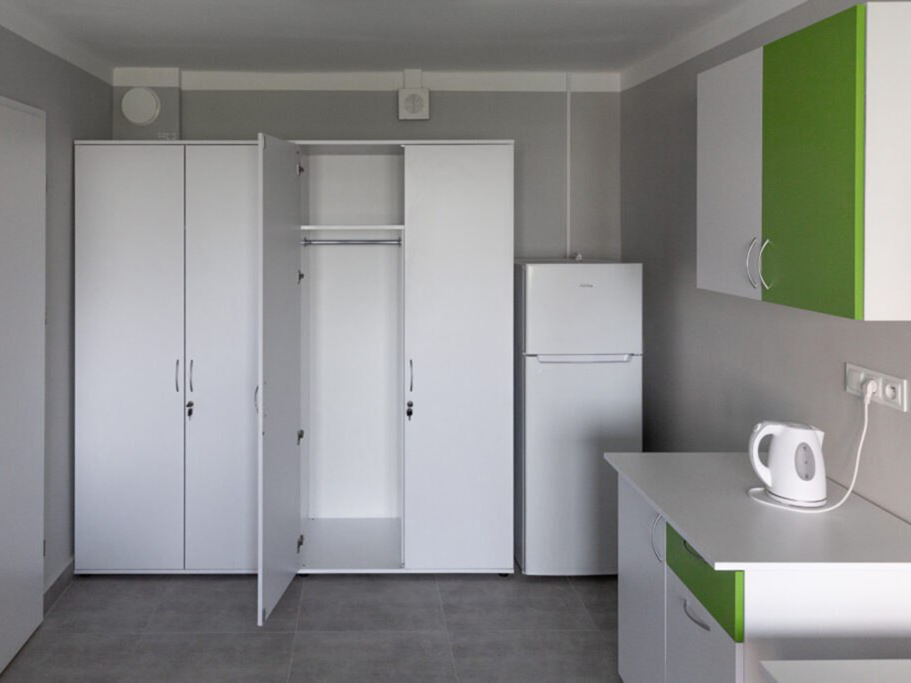 В каждой комнате располагается шкаф для одежды, стол, мягкие стулья, шкаф для обуви, вешалка, холодильник, а также имеются жалюзи на окнах и розетки.