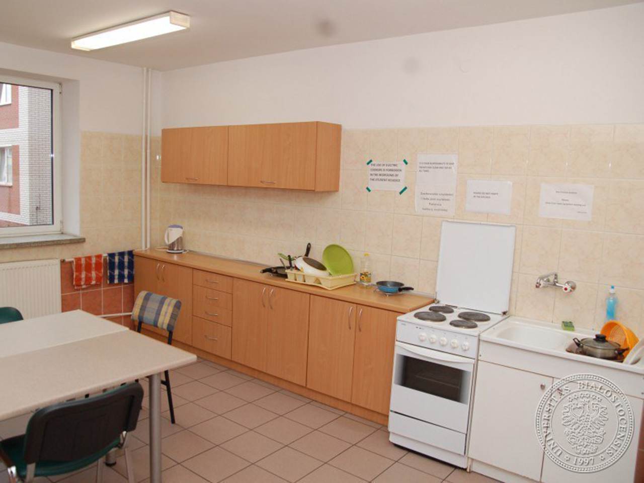 В первом студенческом доме есть одно-, двух- и трехместные комнаты с холодильниками, просторными шкафами и столами. На каждом этаже имеется ванная комната, кухня и прачечная. Кроме того, в общежитии есть учебный зал, комната с телевизором и студенческий клуб.