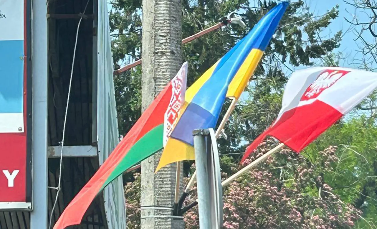 Обновлено 26 мая 2023. Читатели MOST сообщают, что по состоянию на 26 мая флаг Украины и бело-красно-белый флаг Беларуси сняли с флагштоков. Остался лишь флаг Польши.