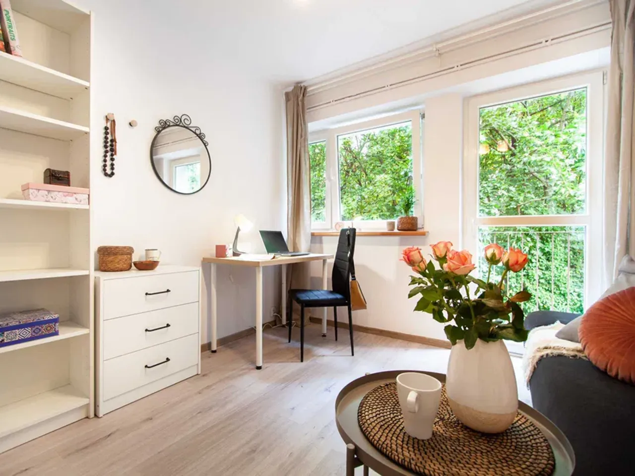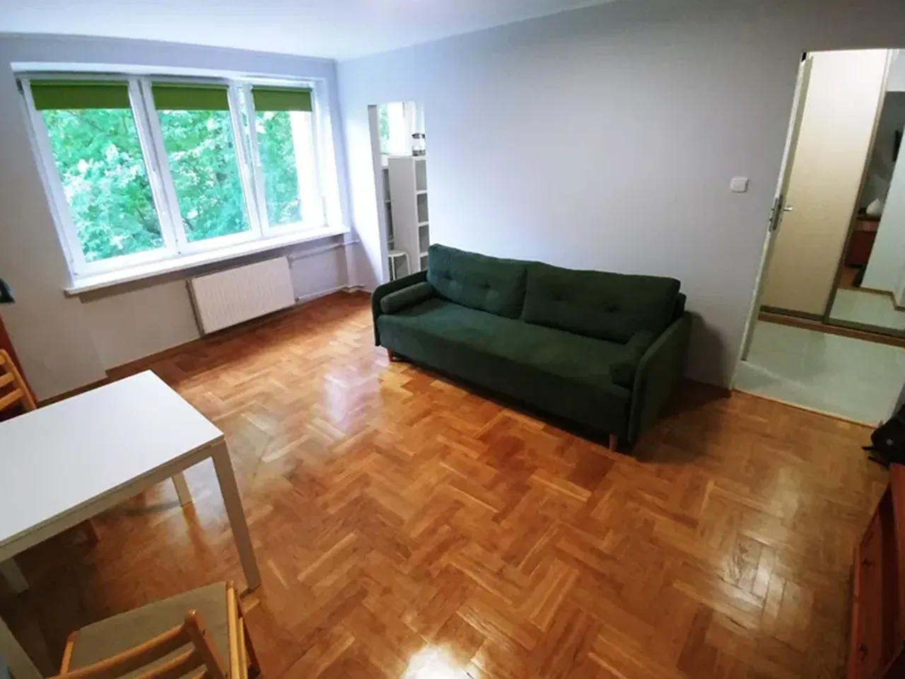 Начнём с недорогого (по варшавским меркам). За 1 400 злотых в месяц, 400 из которых составляет чинш, вы можете получить пусть и не очень большую (15 м2), но опрятную комнату в светлых тонах с раскладным диваном и шкафом.