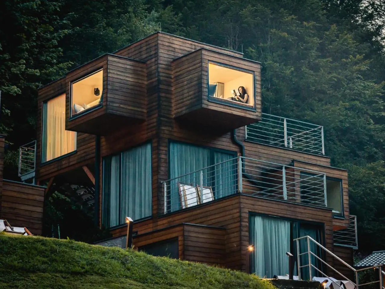 Подвешенная спальня с огромным окном находится в городе Висла на склоне горы Кичера. Апартаменты окружены лесом, рядом есть пруды с лягушками, детские игровые площадки, летний бассейн, сауна, баня и место для гриля.