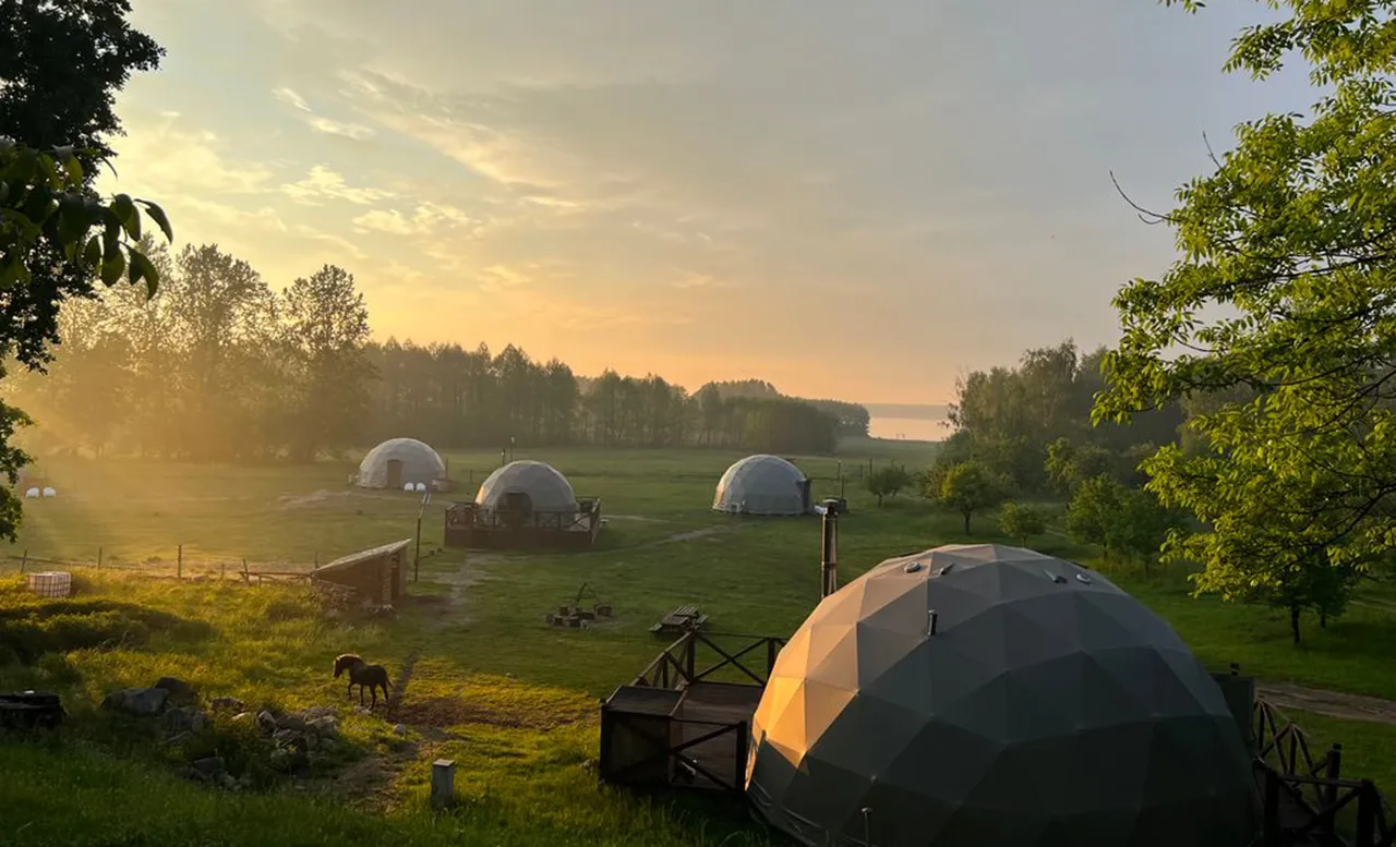 В глэмпинге также есть гамаки, бочки с тёплой водой, бани и озеро.