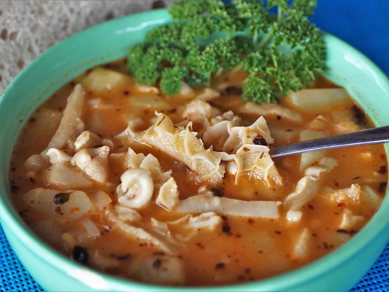 Фляки или суп из требухи — это говяжий или свиной желудок, нарезанный тонкими ломтиками и залитый бульоном. Чтобы блюдо хорошо получилось, желудки следует тщательно очистить ножом или щеткой и много-много раз промыть. Требуху нужно варить очень долго, она должна стать мягкой настолько, чтобы ее можно было легко растереть между пальцами. Затем к бульону добавляют корнеплоды: морковь, петрушку, сельдерей, большое количество специй. Часто в суп кладут сало или свиной жир.