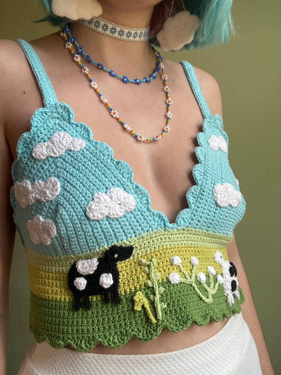 Немного позже вязание стало для Эмили не только спасением от депрессии. Крючок для вязания оказался очень хорошим арт-инстурментом — гораздо более интересным, чем кисточка, карандаш или стилус. По словам девушки, крючок также может быть хорошим инструментом для создания одежды. Первое, что Эмили связала, был топ с коровками.