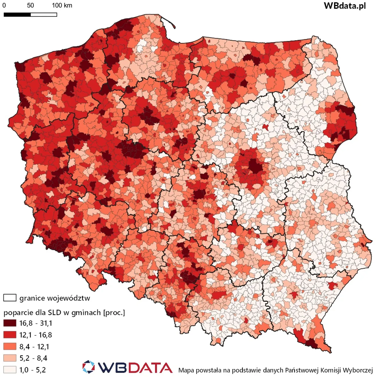Поддержка социал-демократов территориально во многом совпадает с поддержкой либеральных сил. Источник: Wbdata.pl