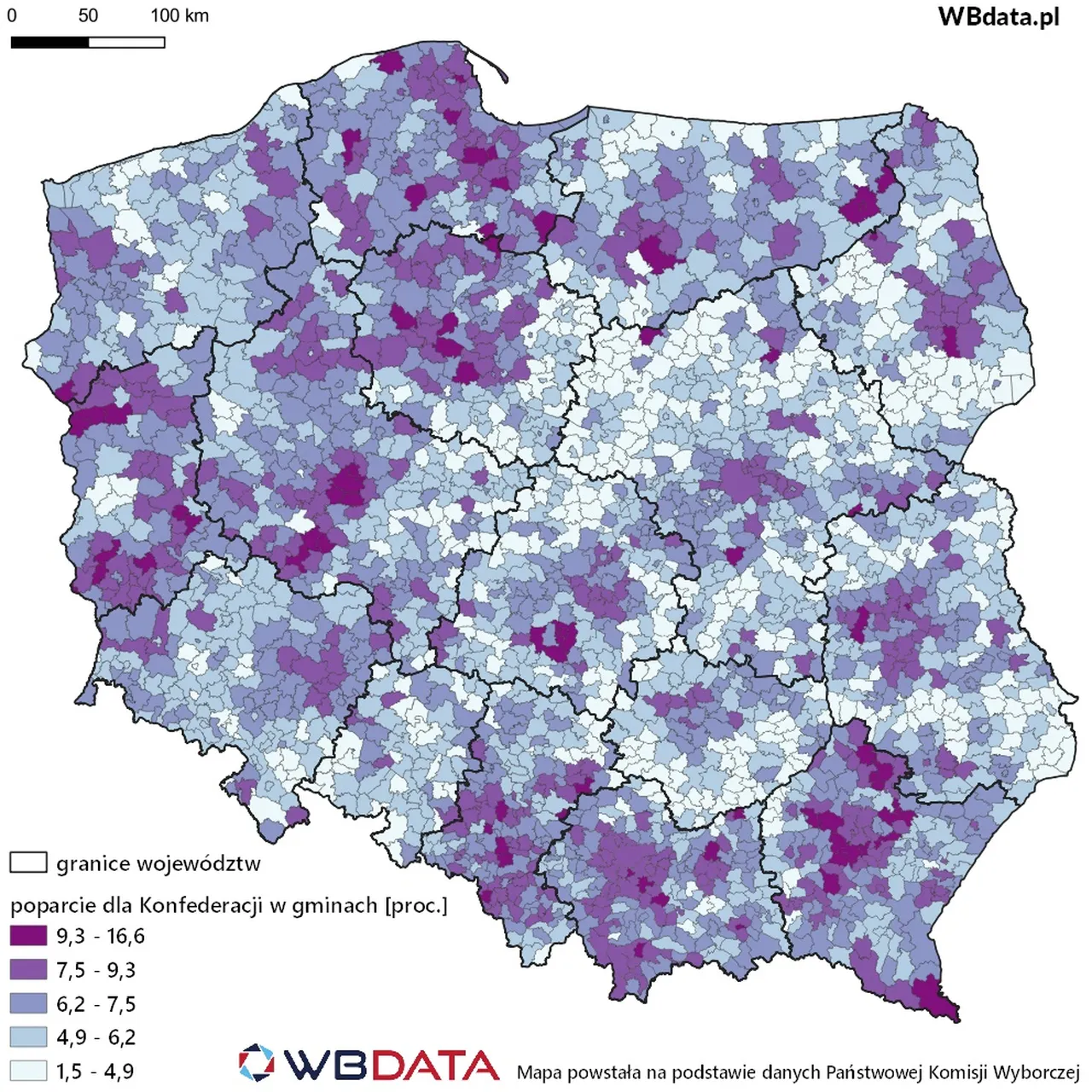 Поддержка «Конфедерации» на выборах 2019 года. Источник: Wbdata.pl