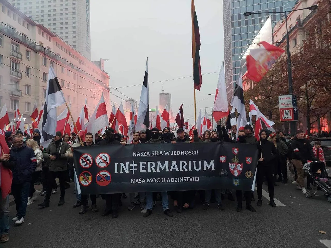 Да маршу быў падрыхтаваны банер з цэнтральным лозунгам на лацінцы «Intermarium — Naša moc u adzinstvie!»