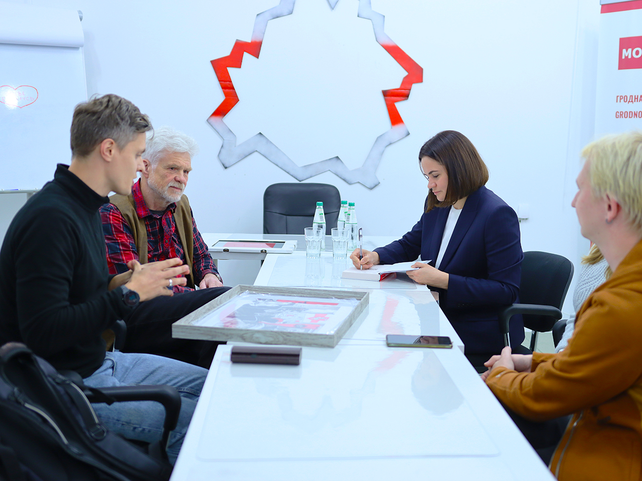 Пасля прэзентацыі Святлана Ціханоўская наведала рэдакцыю MOST. Яна падзякавала журналістам за працу і ўнёсак у вольную Беларусь і падарыла экзэмпляр кнігі «Lodołamaczka» з аўтографам.