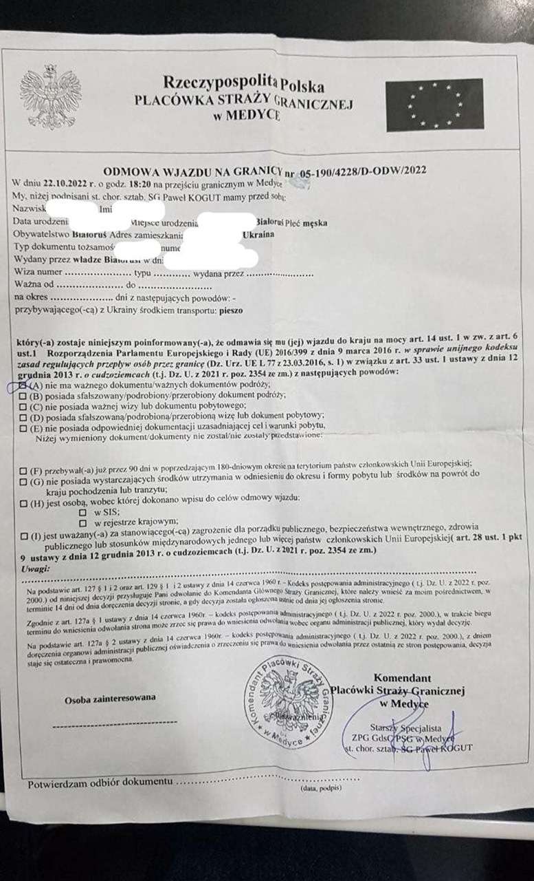 22 кастрычніка мужчына спрабаваў выехаць з Украіны ў Польшчу праз пераход Шэгіні — Медыка. Тройчы. Кожны раз прасіў надаць яму міжнародную абарону.